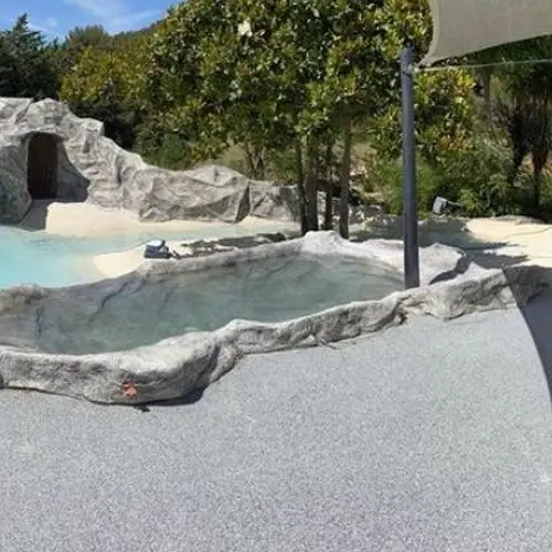 – Surface antidérapante : Grâce à la texture des granulats, la moquette de pierre offre une excellente adhérence, même mouillée, réduisant ainsi les risques de glissades autour des piscines.